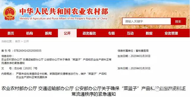 近期,因防范新型冠狀病毒感染的肺炎疫情,一些地方“菜籃子”產(chǎn)品和農(nóng)業(yè)生產(chǎn)資料運輸受阻,出現(xiàn)蔬菜等“菜籃子”產(chǎn)品出不了村、進(jìn)不了城,畜禽養(yǎng)殖所需飼料難以及時補充,種畜禽無法調(diào)運等問題。為確?!安嘶@子”產(chǎn)品市場供應(yīng)和農(nóng)業(yè)生產(chǎn)穩(wěn)定發(fā)展,現(xiàn)就有關(guān)事項通知如下?! ?